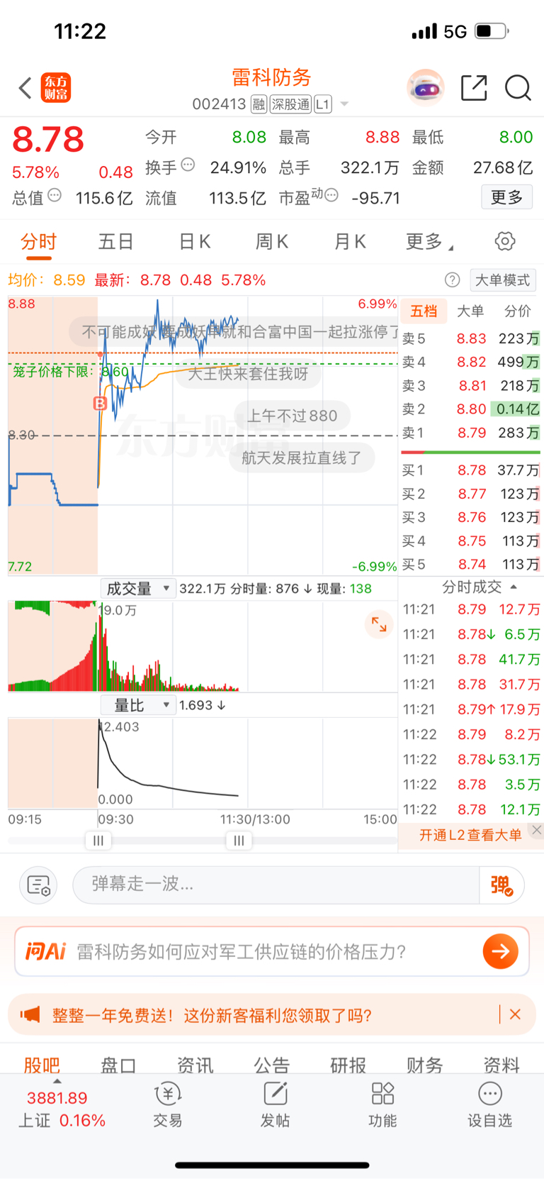 $雷科防务(SZ002413)$ 跳空B上了,希望别让我受伤