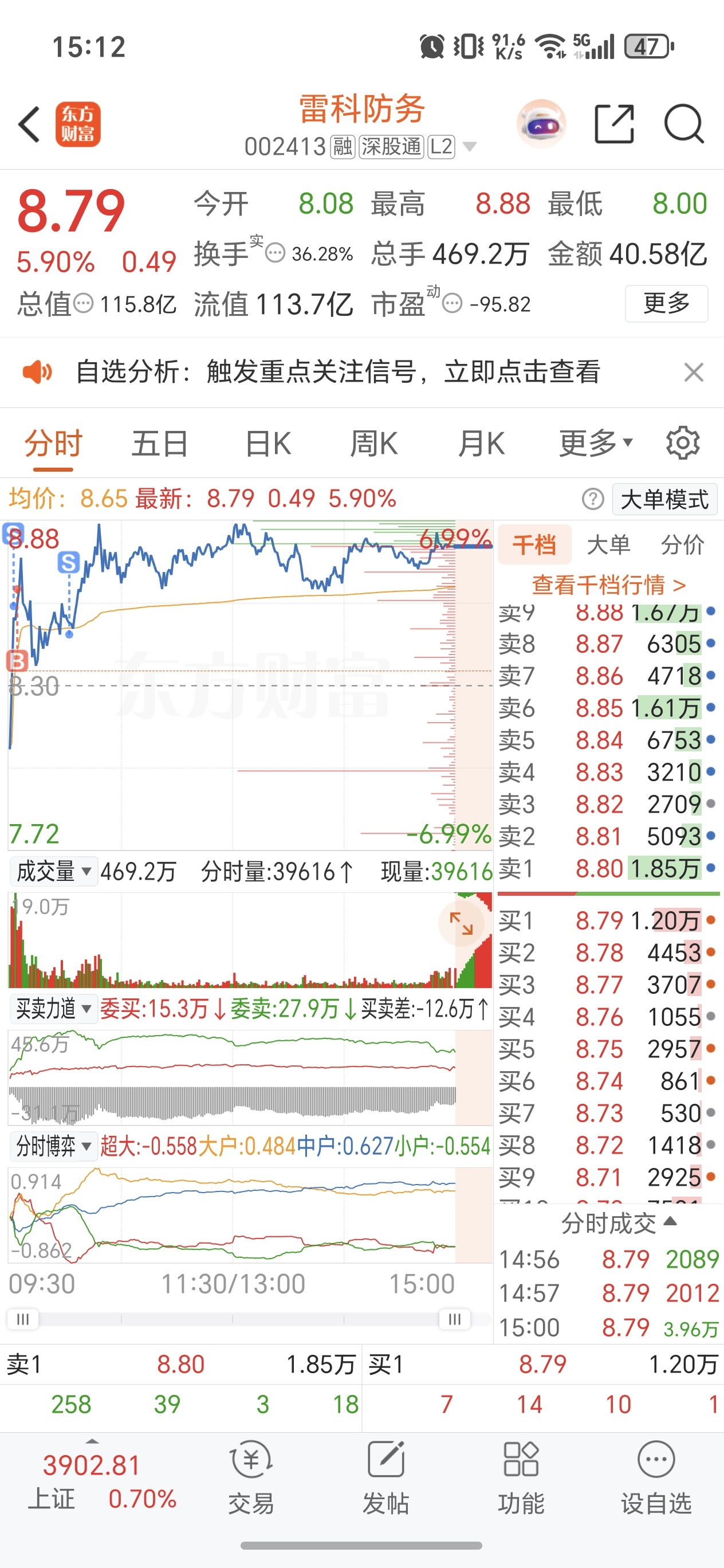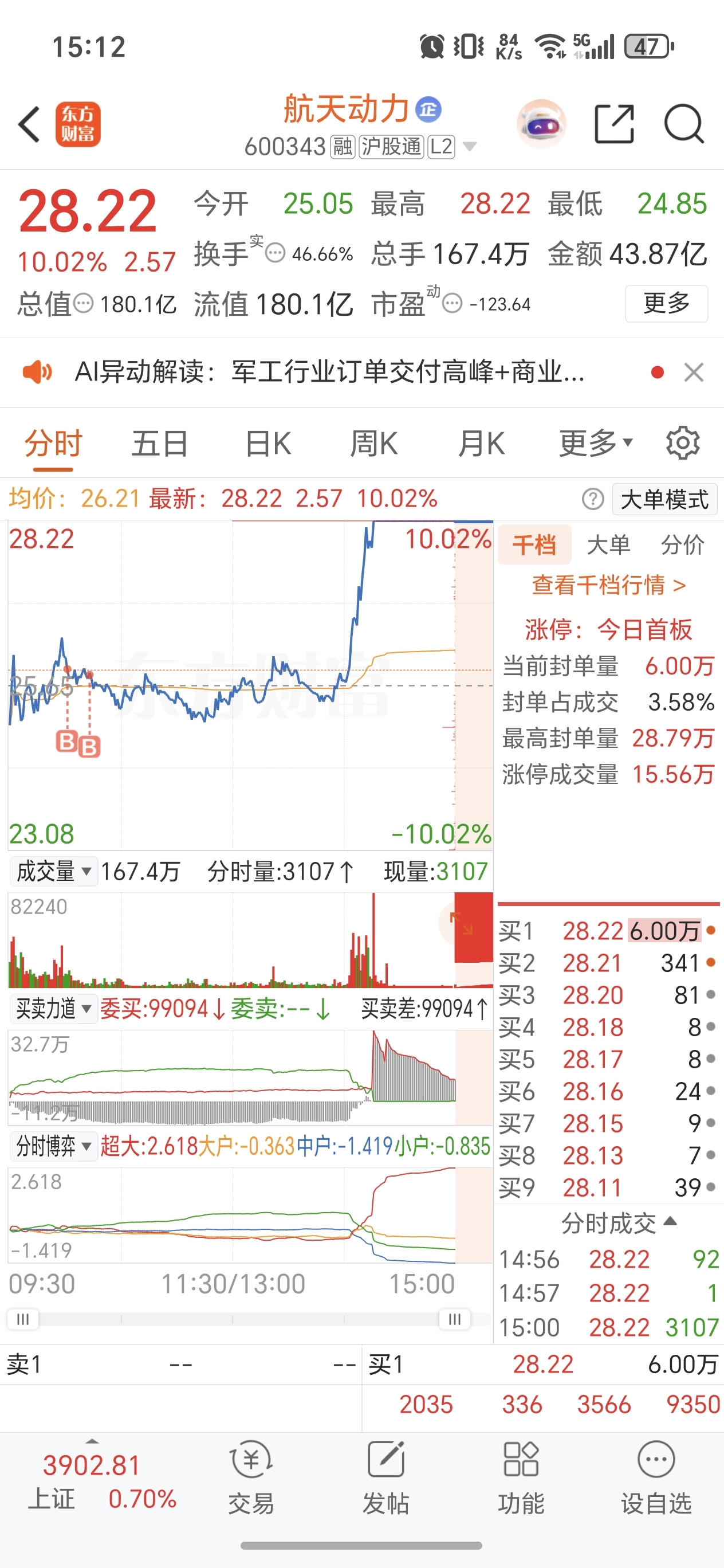 果然有够lj,一直大单压盘受不了上午卖出只剩了底仓(上午买的卖不了)。反手进了动力(五日线上趋势上行),下午航天板块得到加强直接四次上攻封板,再看雷科依旧还在大单压盘(已经跟不上航发的动作和脚步了)