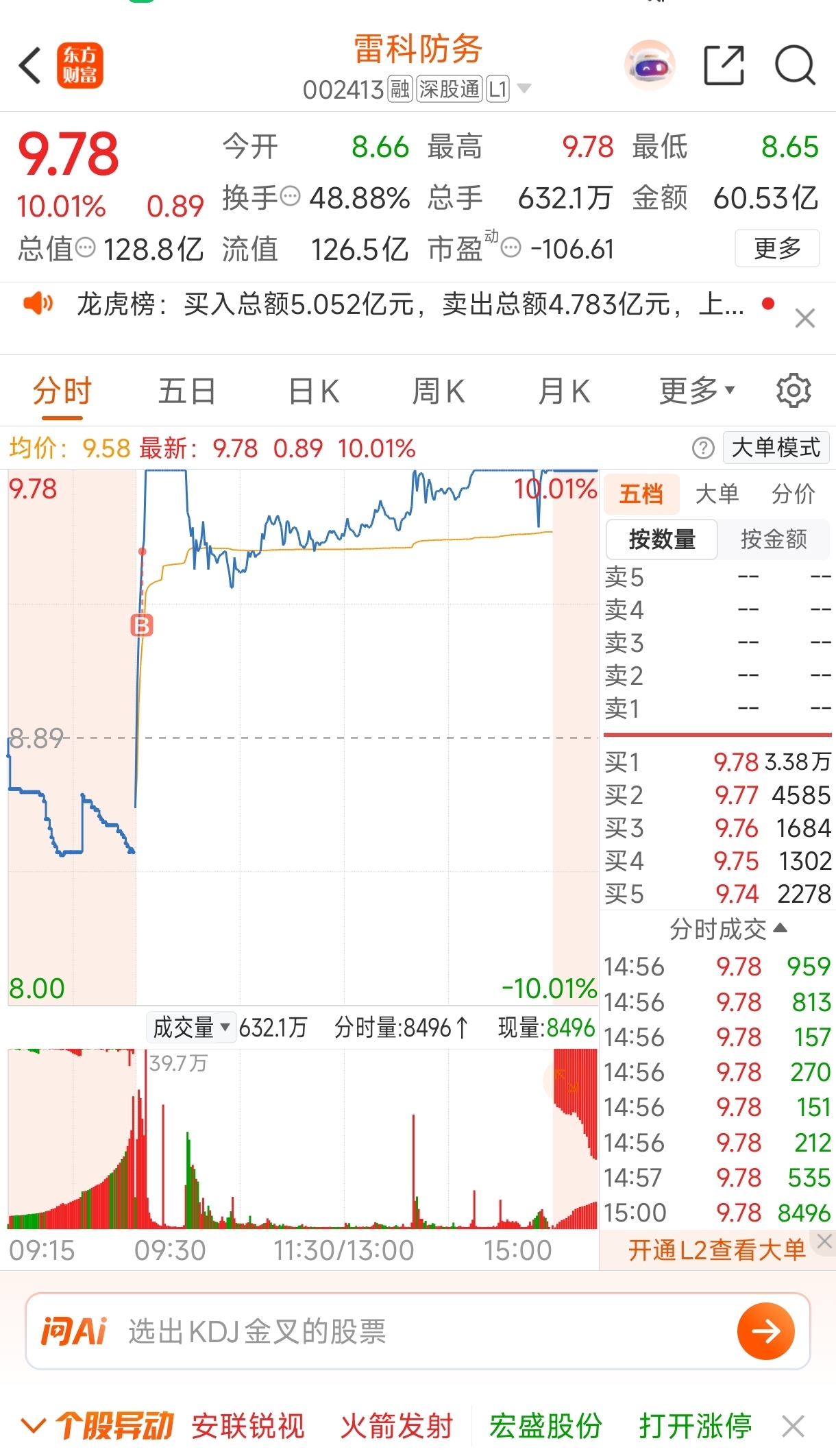 $雷科防务(SZ002413)$ 下午没看盘反而封扳了