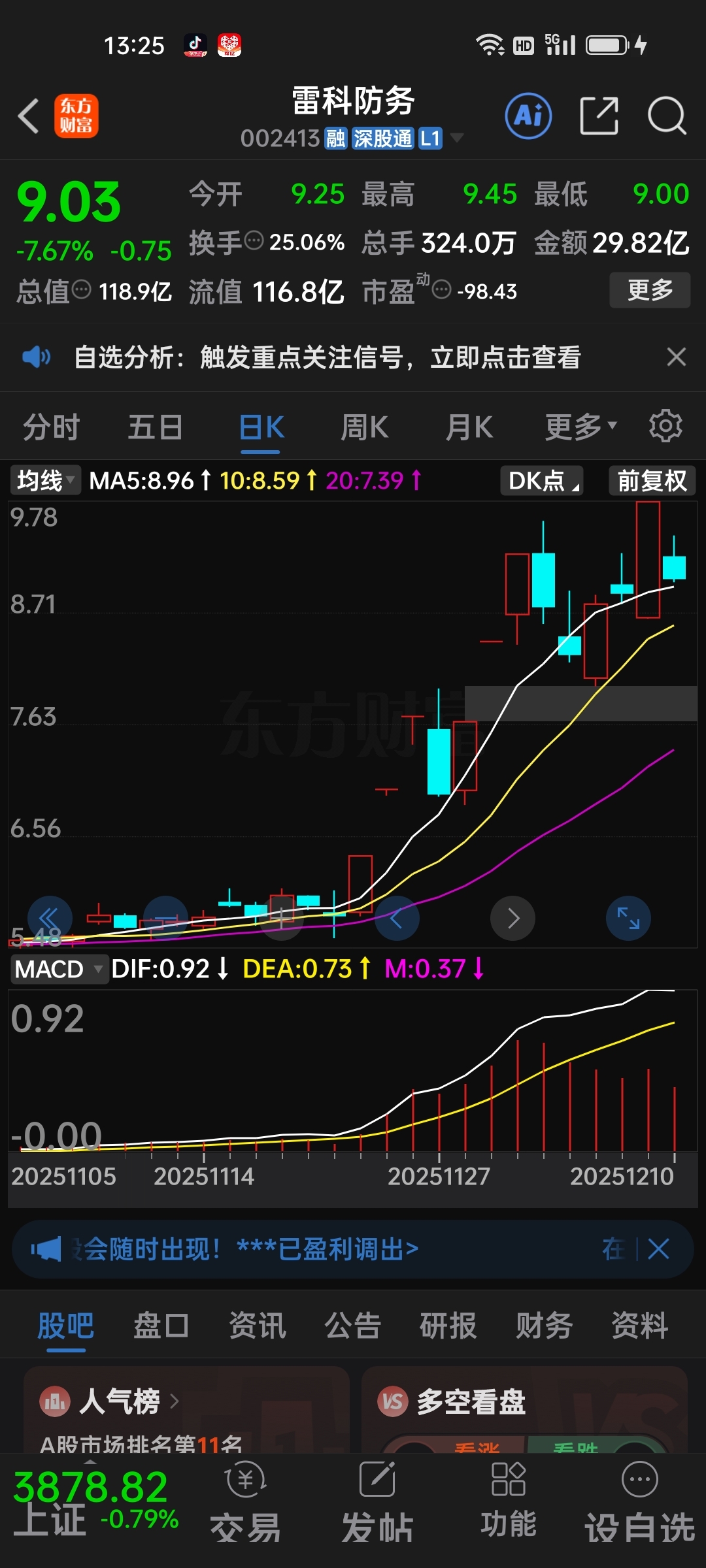 $雷科防务(SZ002413)$ 明天才有买点,在十日线附近买!家人们今天不要买!!!