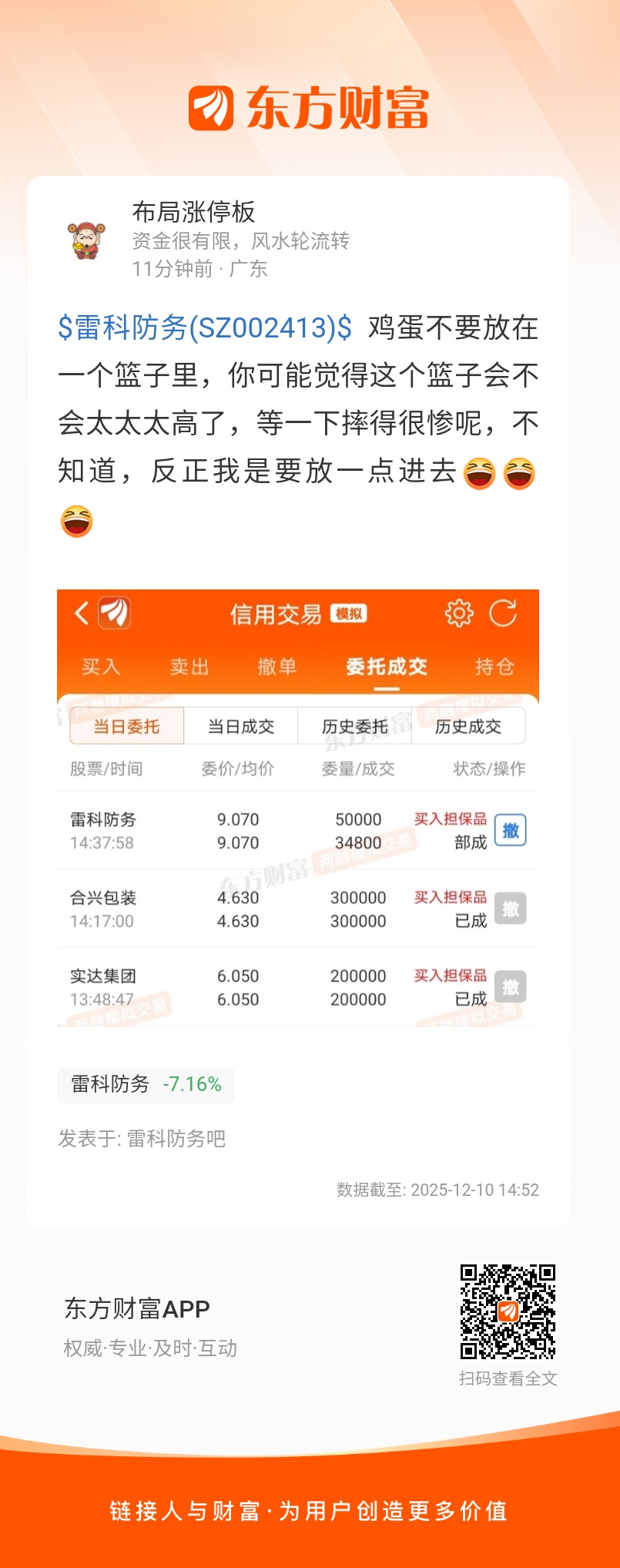 $雷科防务(SZ002413)$ 鸡蛋不要放在一个篮子里,你可能觉得这个篮子会不会太太太高了,等一下摔得很惨呢,不知道,反正我是要放一点进去