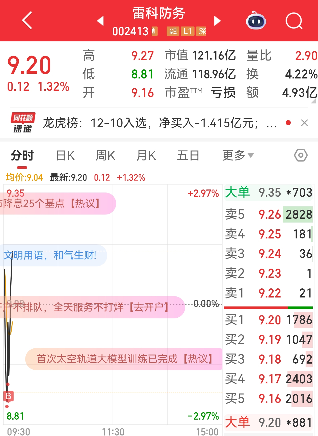 $雷科防务(SZ002413)$ 雷科防务开盘下杀时加了两笔,继续看好商业航天板块,分歧就是低吸机会,有先手可以做T,没有先手不建议追高。