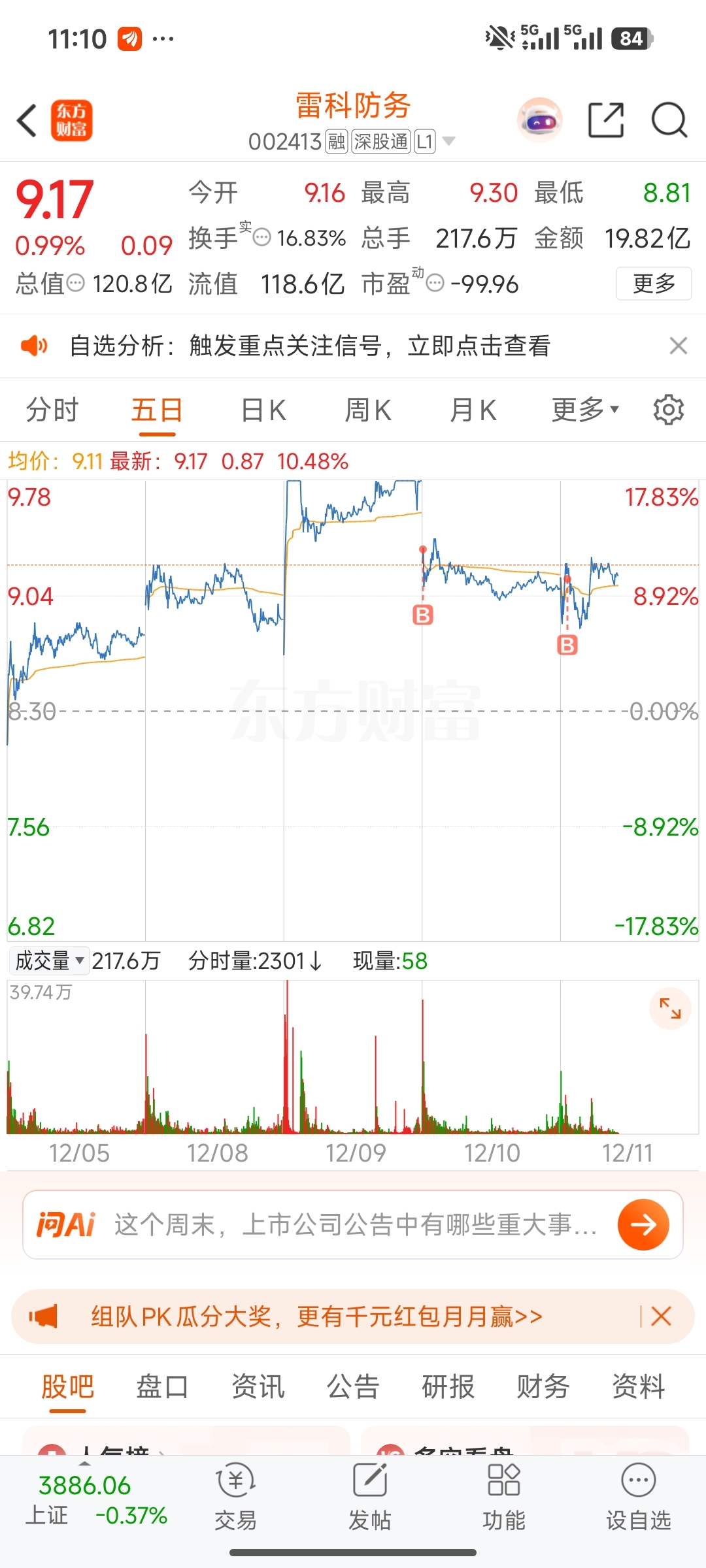 $雷科防务(SZ002413)$ 五日线走势,明日反包涨停,