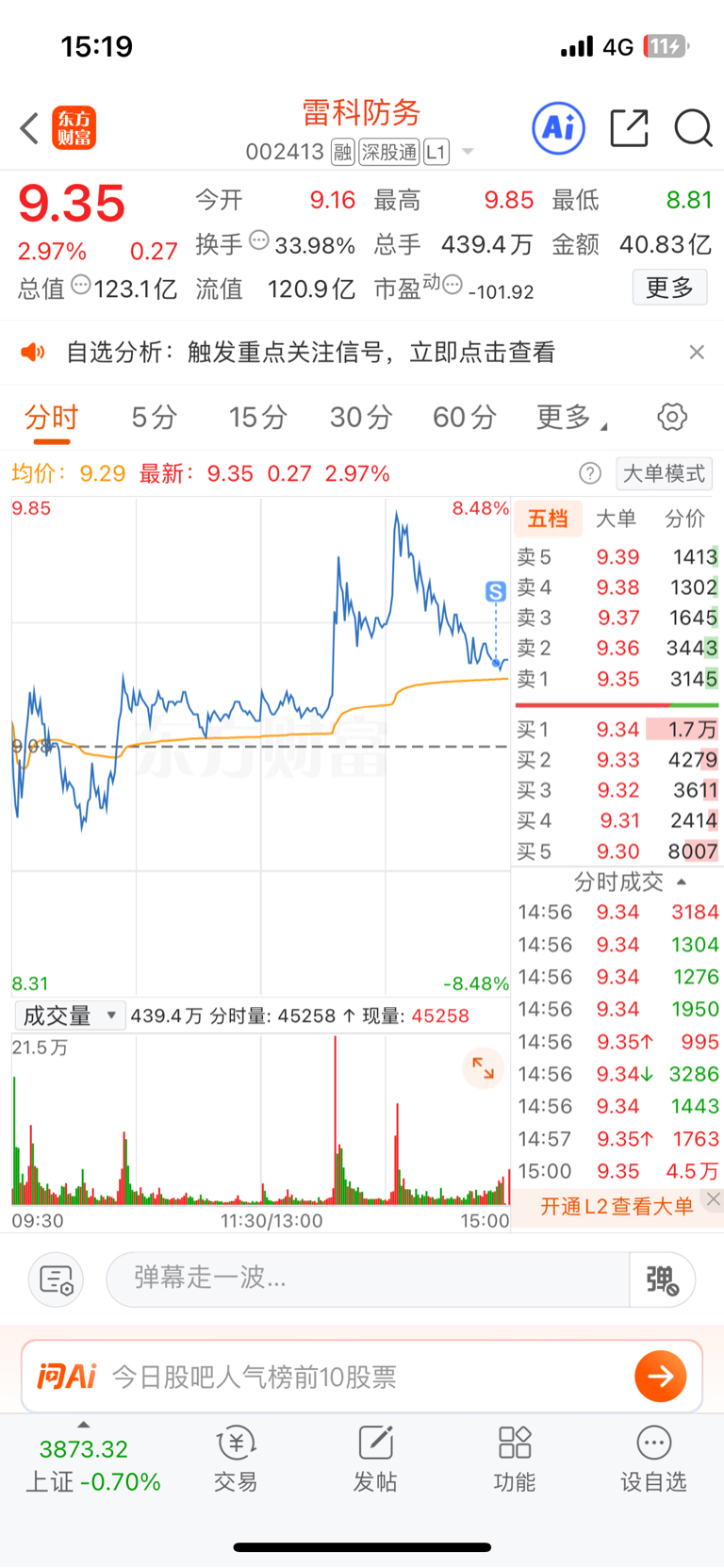 $雷科防务(SZ002413)$ 年仅19岁手握数十家上市公司股份尾盘走了,主要是没卖好小赚一点