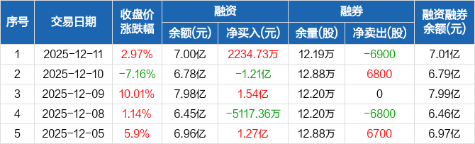 雷科防务:融资净买入2234.73万元,融资余额7亿元(12-11)