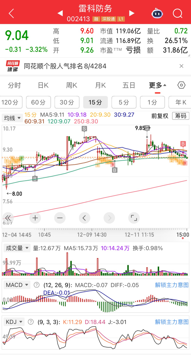 $雷科防务(SZ002413)$ 当接盘侠的来了,反正一锤子买卖,不会补仓,愿赌服输,9.07