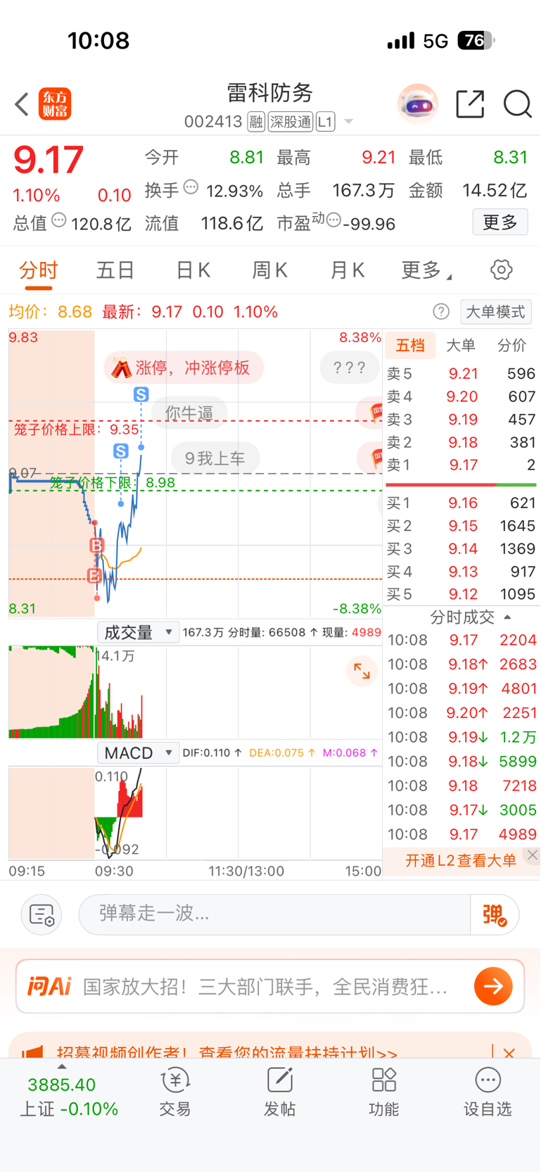 $雷科防务(SZ002413)$ 早上还很担心的,毕竟仓位太重了,现在T出去后,持仓收益15%,心里一身轻松,局势明朗多了