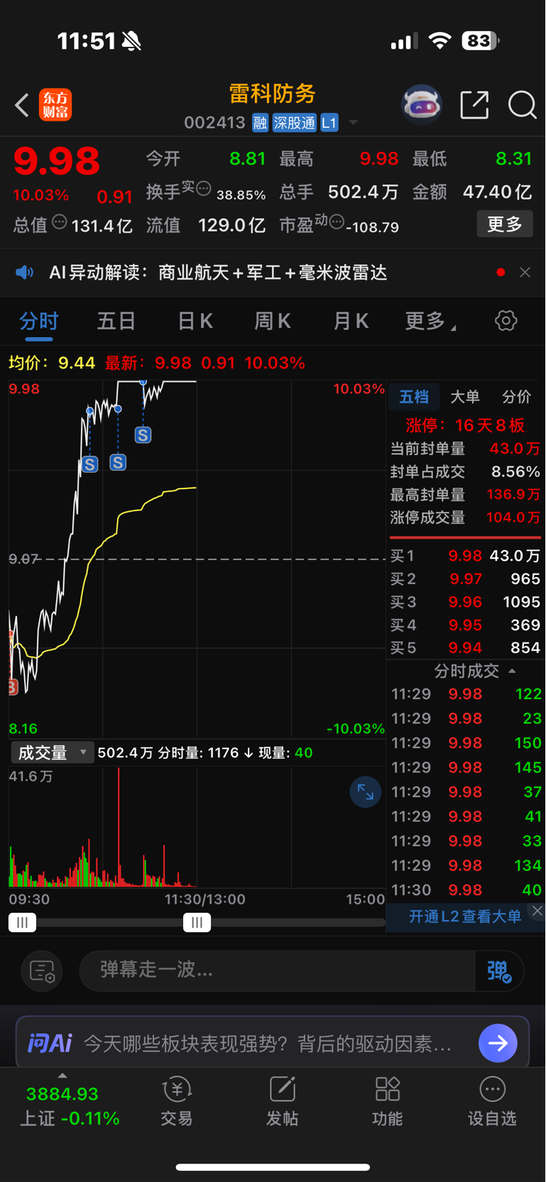 $雷科防务(SZ002413)$ 大部分卖了,感谢主力不杀之恩。认知以外的钱赚不到就算了,这个月还差 3 万回本,继续努力