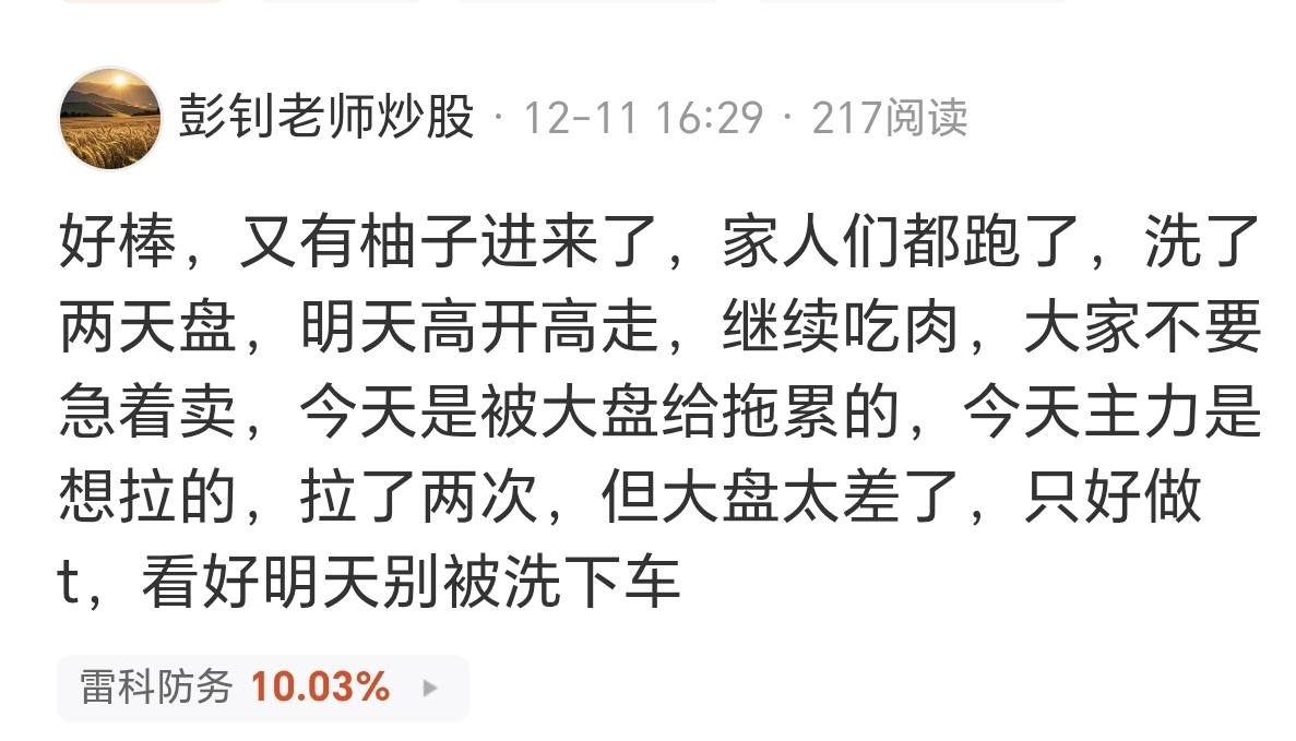 $雷科防务(SZ002413)$ 老师两个星期以前就说了雷科一定是航天的龙头,前几天只是暂时的调整,大家拿住,不要把筹码交出去。今天开盘我又买了几千手,今天吃了大肉,还是那句话,不到20老师我一股也不卖
