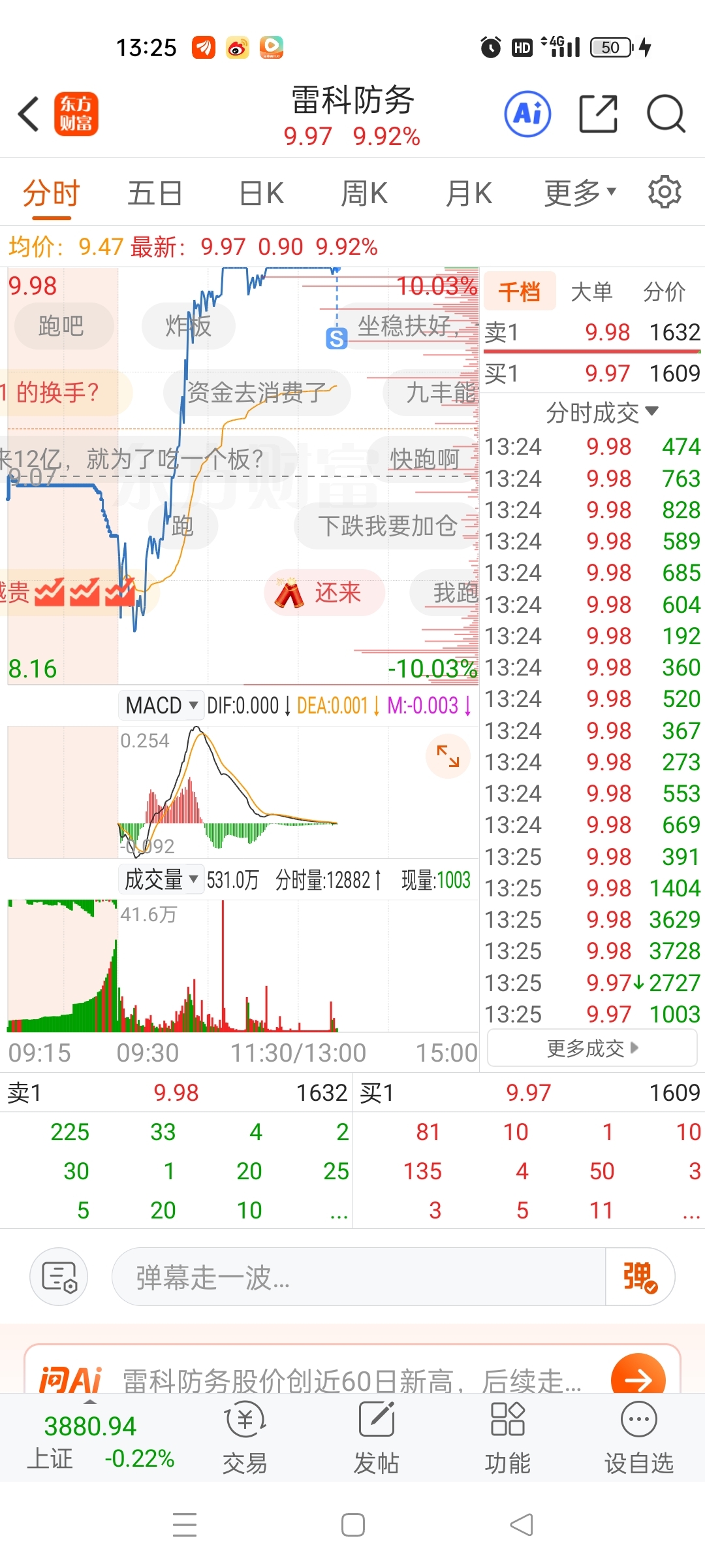 $雷科防务(SZ002413)$ 跑了,反反复复,留下发财,上次也是这个样子炸板,第二天深水,跑都跑不了