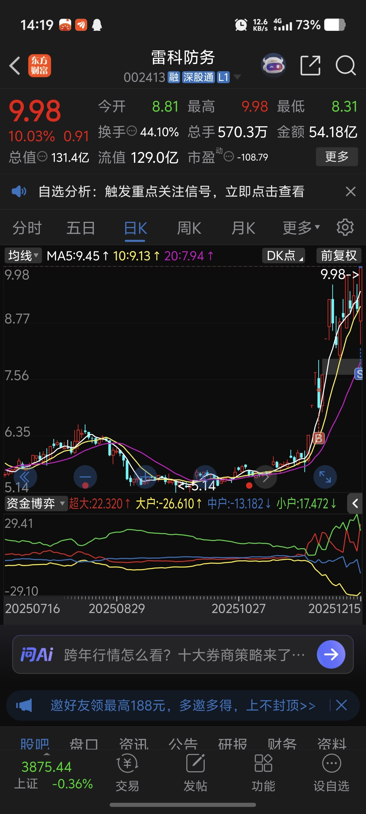$雷科防务(SZ002413)$ 你可以涨了,真的太折磨了,一次t都没做过