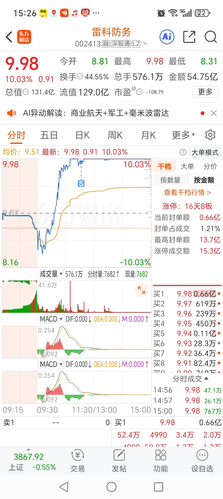 $雷科防务(SZ002413)$ 兄弟们对不住了,发展也是我的爱,半仓去救他,稳住板块从我做起。