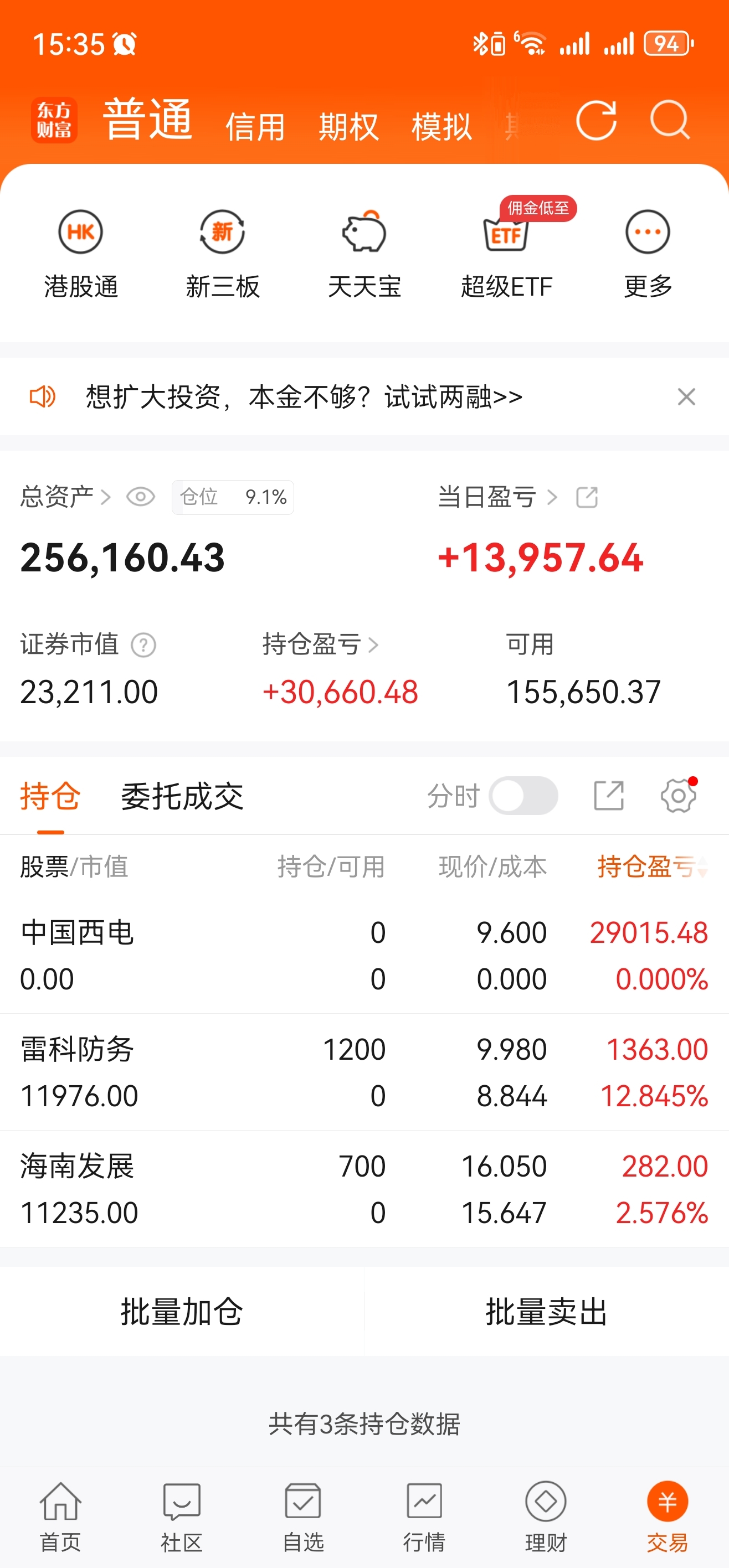 $雷科防务(SZ002413)$ 今天西电我卖早了8个多点没赚上,弄了5个多点,不过最后也是总计12个多点了,但是抄底的俩支股,海南就不说了,雷科我是真没想到,这2个都是小仓位试水去了,结果雷科涨势最大,不然今天就彻底回本了