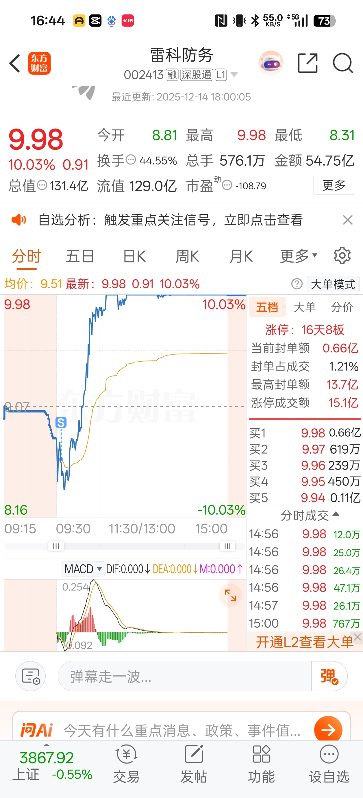 $雷科防务(SZ002413)$ 两次进出都大亏,当我格局一整天的时候,这货一天都水下不拉