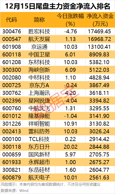 从个股来看,胜宏科技、航天发展、京运通3股尾盘主力资金净流入金额超1亿元。中国卫星、东材科技、海峡创新、中材科技等主力资金净流入也居前。