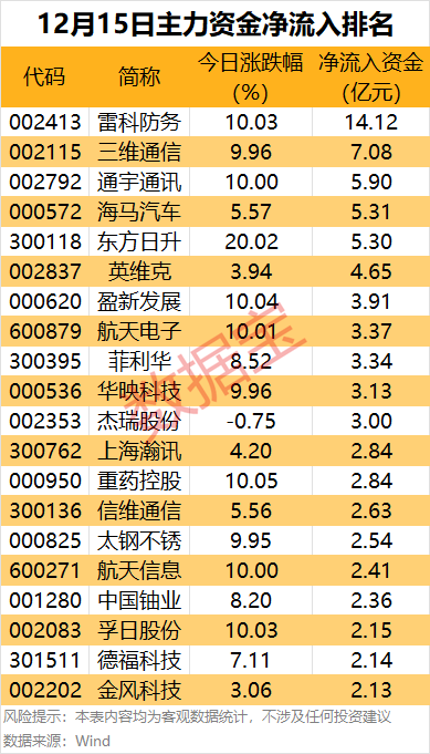 商业航天概念股雷科防务、三维通信、通宇通讯主力资金分别净流入14.12亿元、7.08亿元、5.9亿元,排名前三位。今日A股市场商业航天股再度集体爆发,其中,雷科防务专业从事雷达系统、卫星应用、智能控制、安全存储、智能网联等业务;龙虎榜数据显示,上榜营业部席位全天成交14.34亿元,合计净买入7.65亿元;具体来看,深股通专用席位、机构席位分别净买入1.99亿元、1.51亿元。