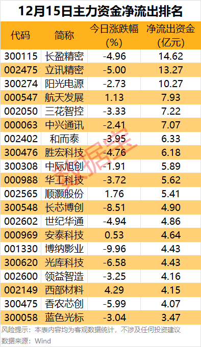 据数据宝统计,中际旭创主力资金净流出金额超2亿元,中兴通讯、长盈精密、和而泰、龙洲股份、阳光电源、天孚通信、光库科技等个股尾盘主力资金净流出居前。