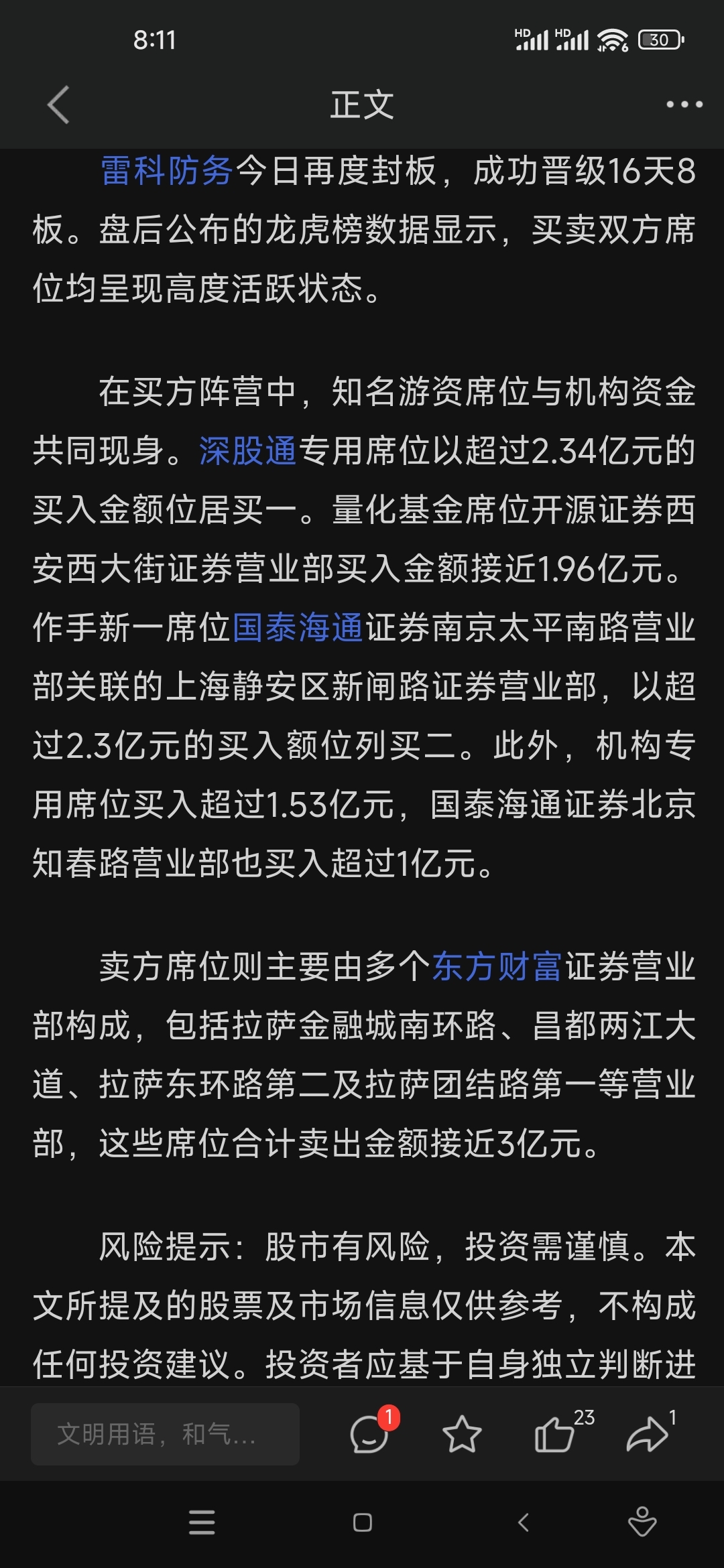 $雷科防务(SZ002413)$ 散户基本上跑完了,连作手一新都来了,主升浪开始,明天大概率一字板涨停