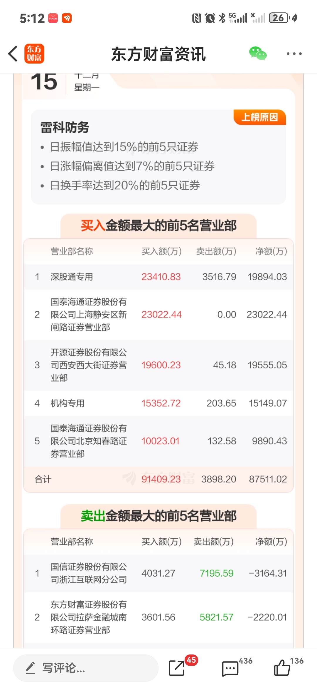 $雷科防务(SZ002413)$ 昨天机构买的1.5个小目标和榜四,今天是不是锁仓了?等于今天就是这两个砸盘王砸的?有没有懂得大神解释一下