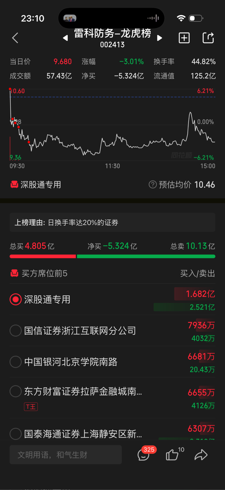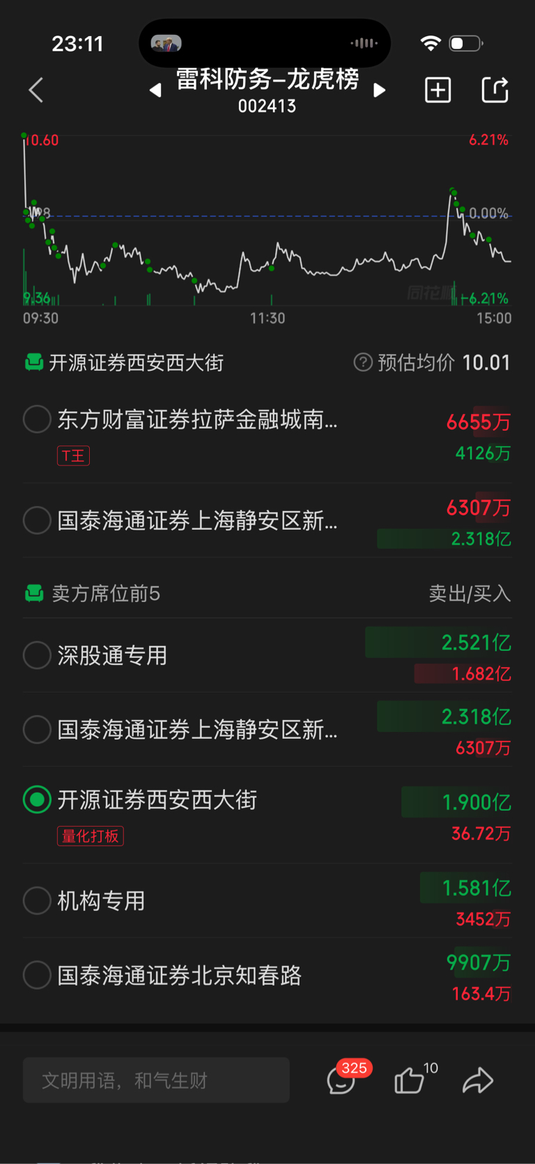 $雷科防务(SZ002413)$ 很多新韭菜喜欢看龙虎榜,总想在里面找到一丝玄机,但是普通龙虎榜看不出什么,今天教新韭菜一招能看到龙虎榜营业部和机构什么时候砸盘的,均价是多少的。只要你下载一个同花顺软件,在里面的龙虎榜里找到上榜的股票就能看到