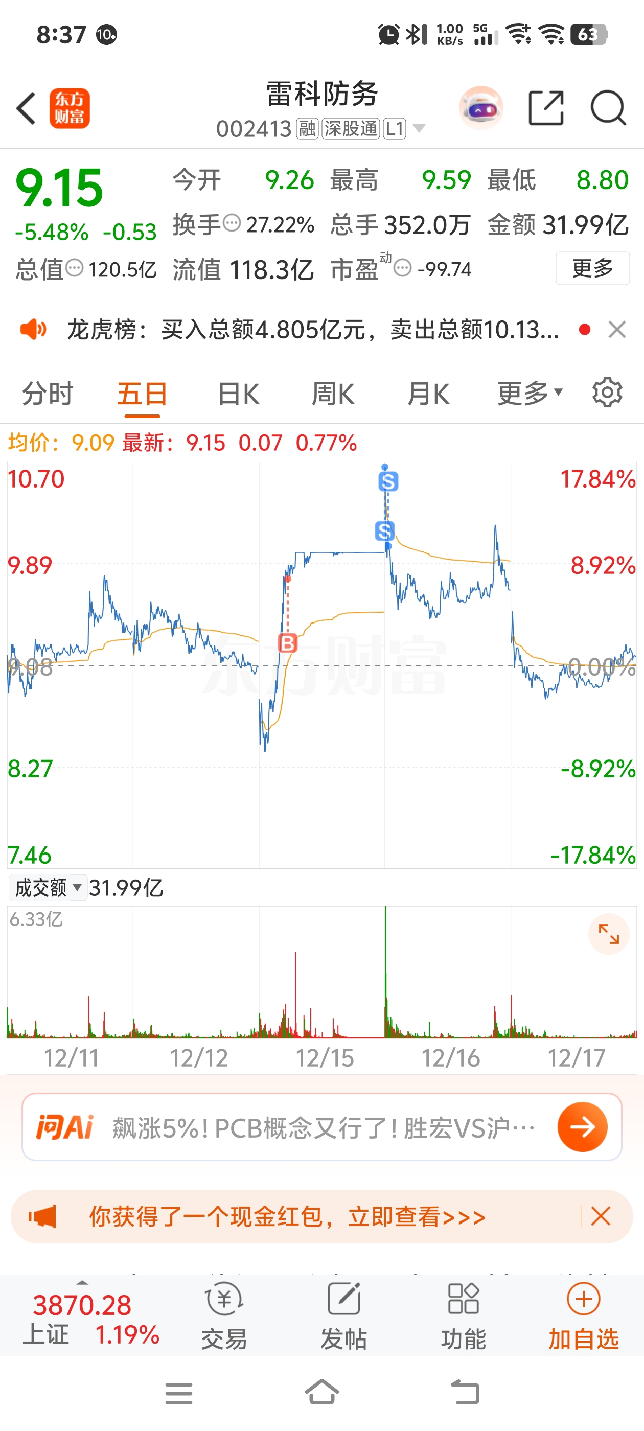 $雷科防务(SZ002413)$ 2天8个点昨天走了,如没有走就套了,险啊