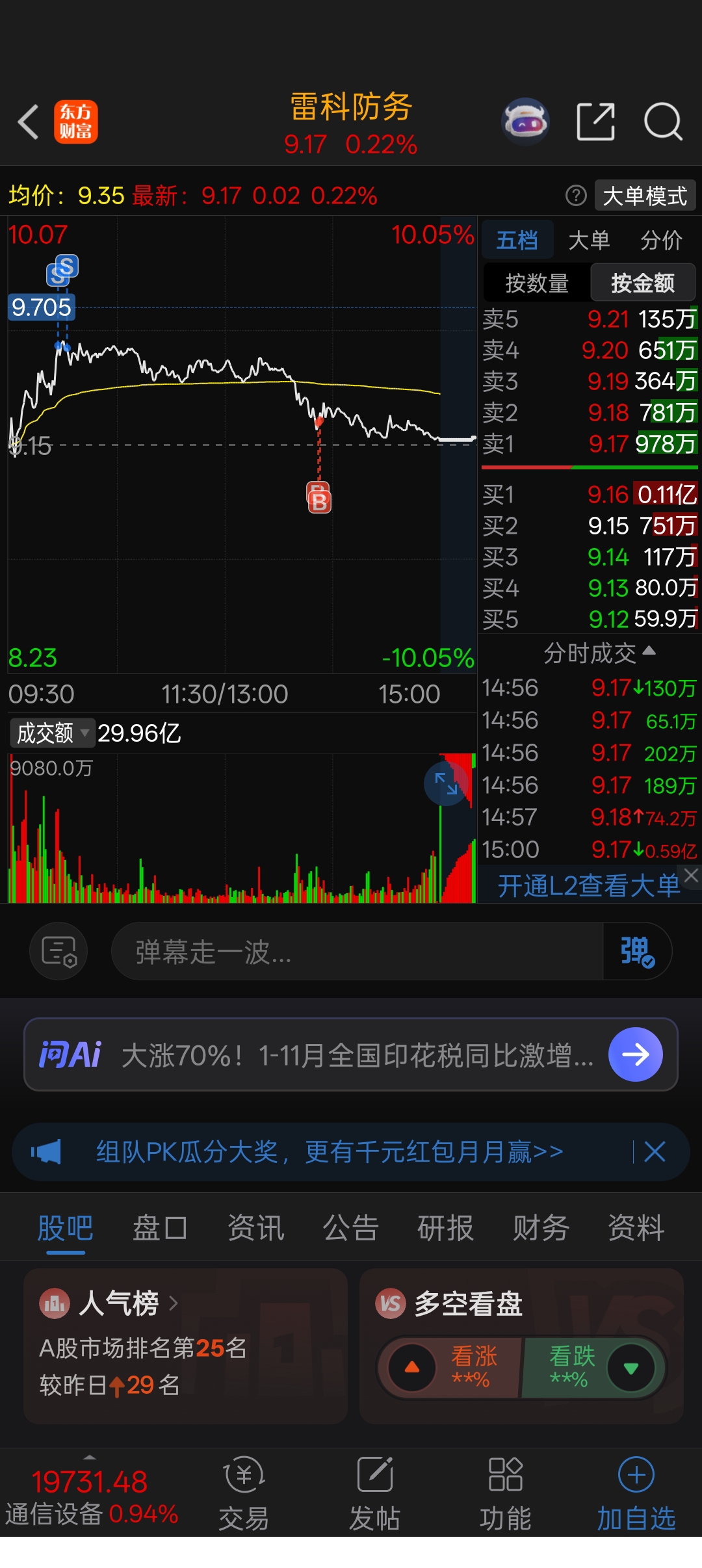 $雷科防务(SZ002413)$ 按道理,明天应该涨停