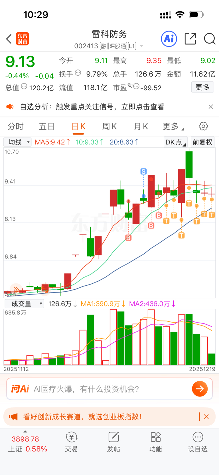 12月4号从航天发展逐步减仓,想着高切低,在航天动力和雷科防务里面选了雷科防务。那时候航天动力25附近,雷科防务减仓价格8.88。然后什么都不想说了,只能在雷科里面做t玩玩,