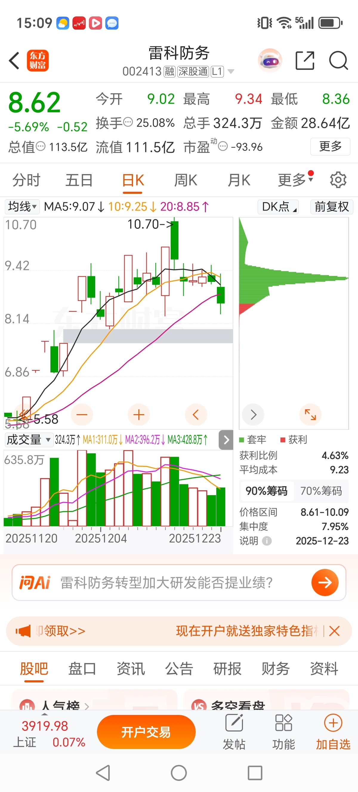 $雷科防务(SZ002413)$ 获利盘几乎没有了,95%的人都亏钱了,所以明后天跌到8块可以抄底,毕竟商业航天这么多股票目前雷科是涨的最少的