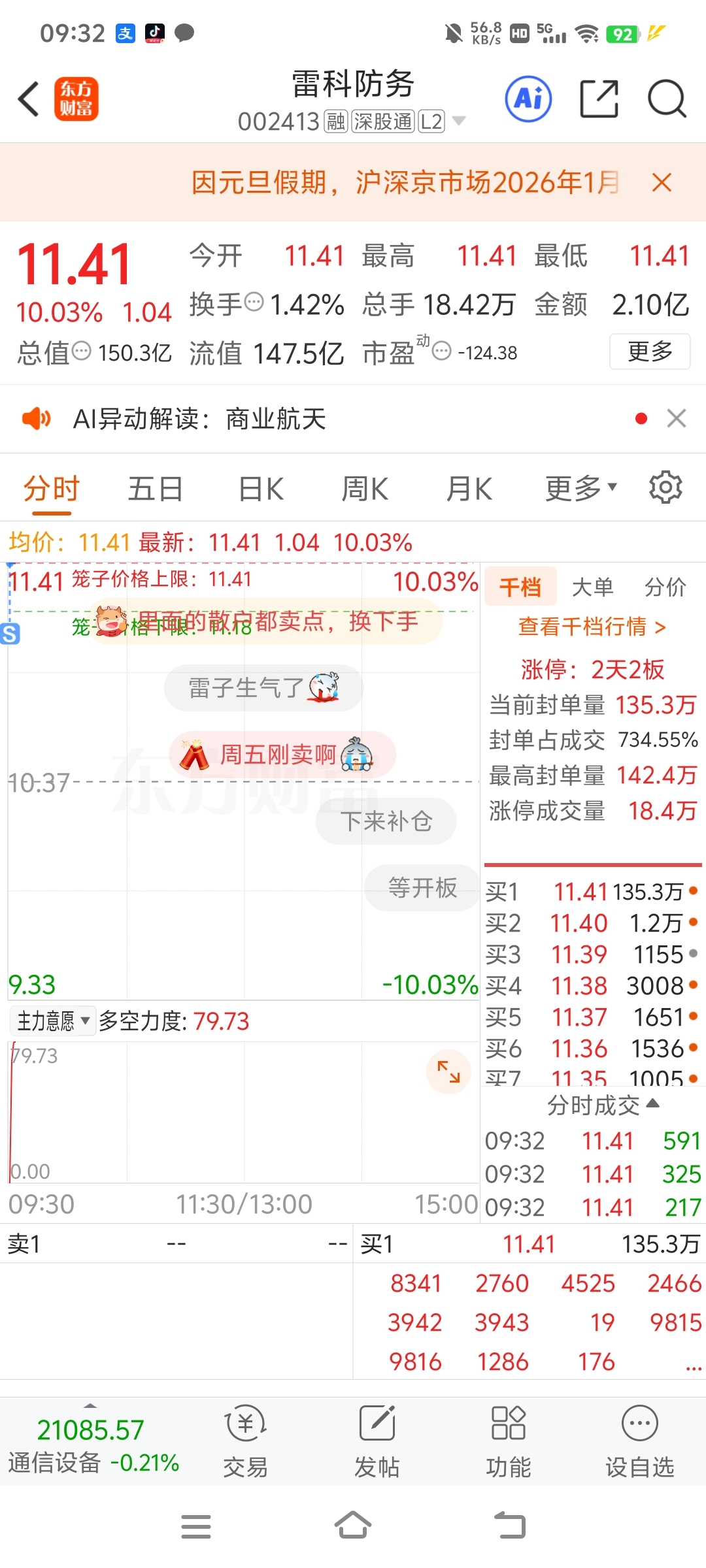 $雷科防务(SZ002413)$ 吃了10个点,走了,不贪心,感谢主力大哥,