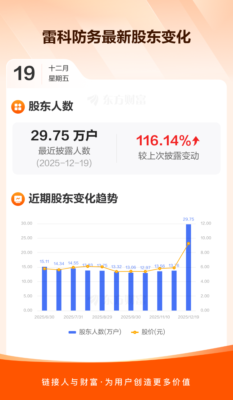 雷科防务最新披露数据显示,截至12月19日公司股东户数为29.75万户,较上期(2025年11月20日)增加15.98万户,增幅为116.14%。户均持有流通股数量由上期的9395股下降至4346股,户均持股金额由上期的5.53万元减少至4.03万元。