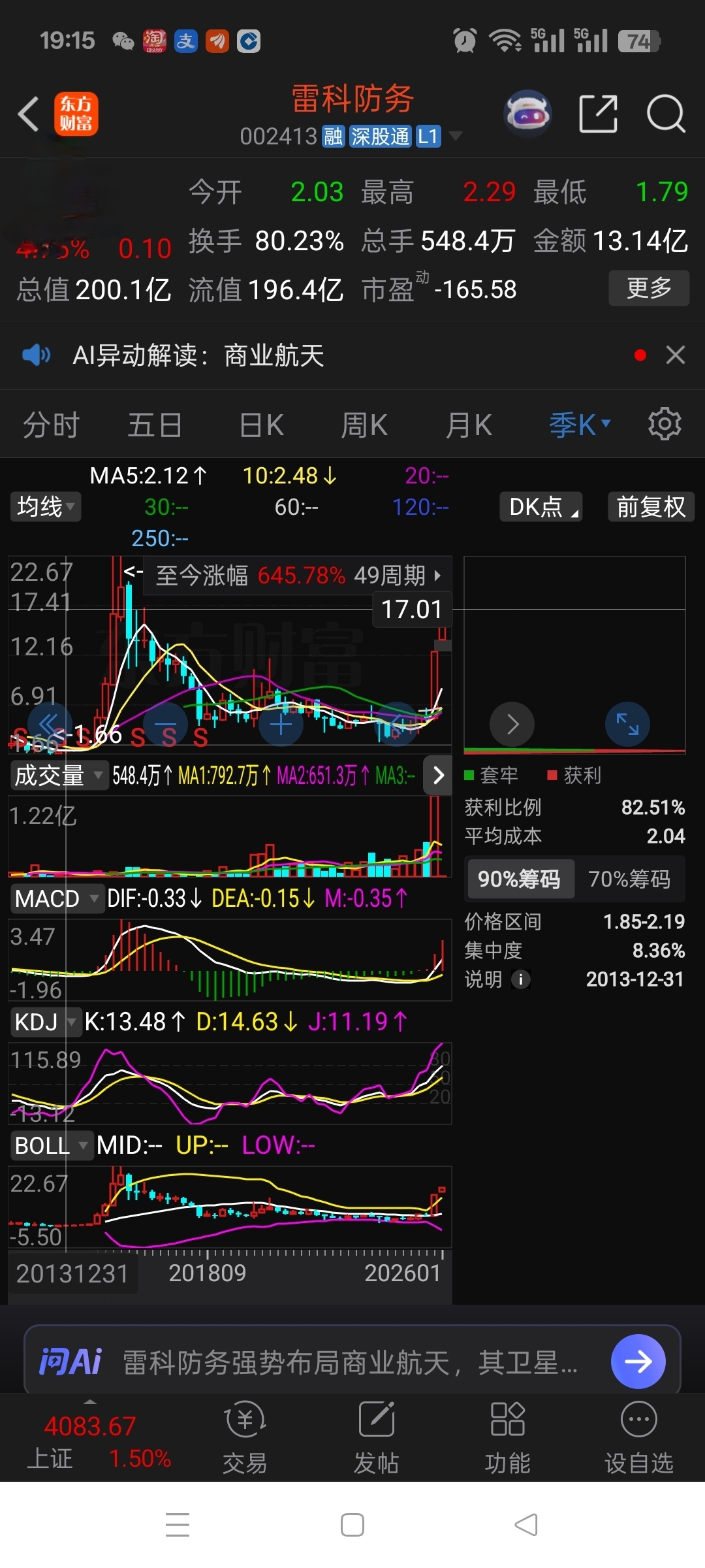 $雷科防务(SZ002413)$ 雷科防务:今天正常放量,晋级五连板,明天谨防前期高点17附近的抛压,谨防踩踏发生。预计会在13.5--17元附近波动1-2周,让底部筹码充分释放,提升持有筹码的成本,以便减少阻力未来可以进一步拉升,可以走的更远。