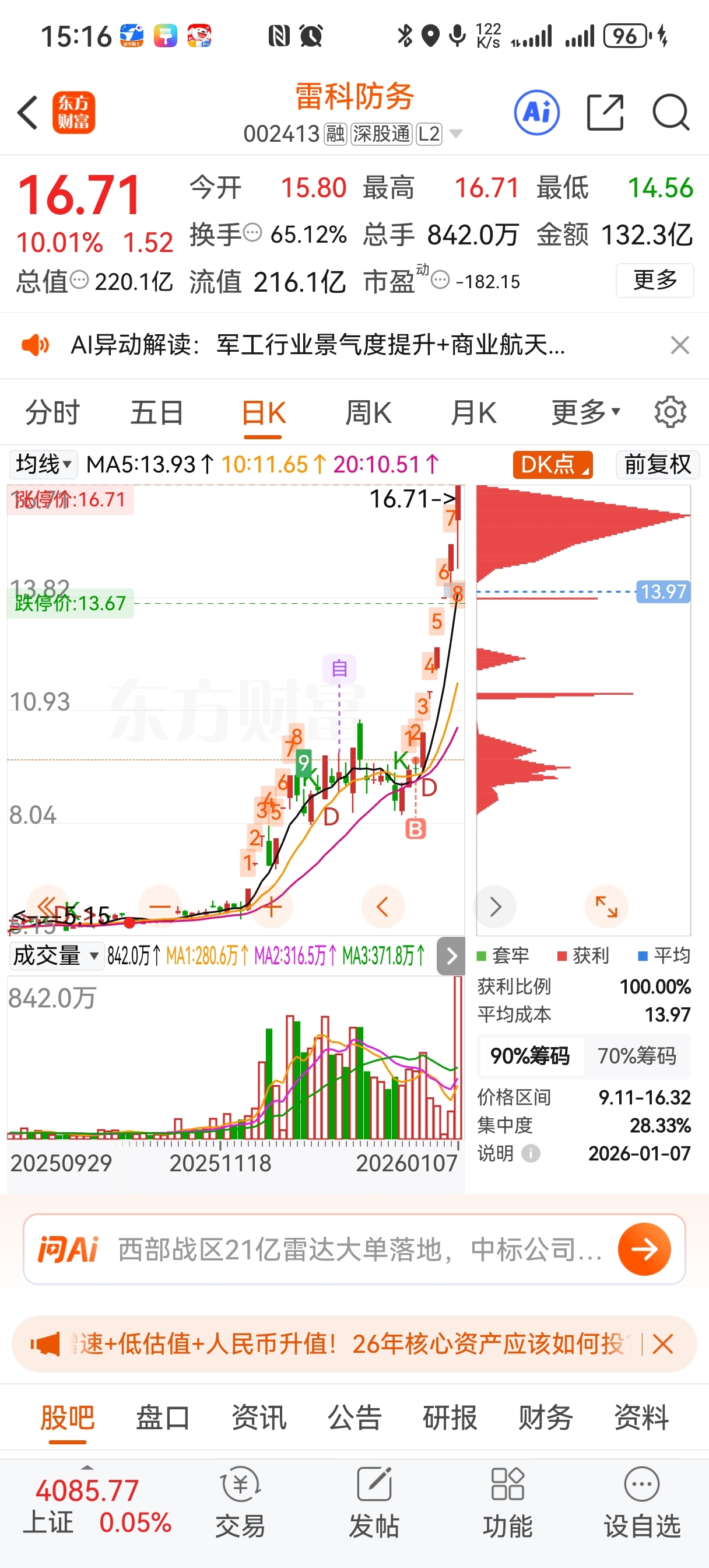 $雷科防务(SZ002413)$ 明天六进七,不断板不走