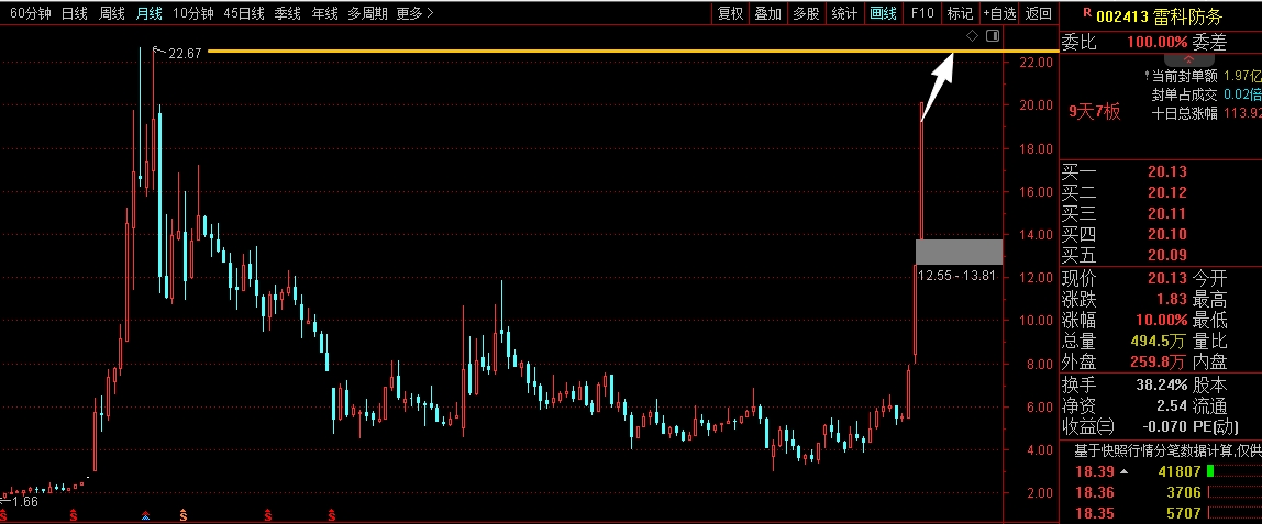 $雷科防务(SZ002413)$ 连续大幅拉升,这里看短线已经没有意义了,再拉升,就看月线,历史前高位置22.67附近的压力吧,真能到,可以考虑高抛一些仓位应对了,特别中间追高成本不低的,不用太纠结。#炒股日记# #收盘点评#