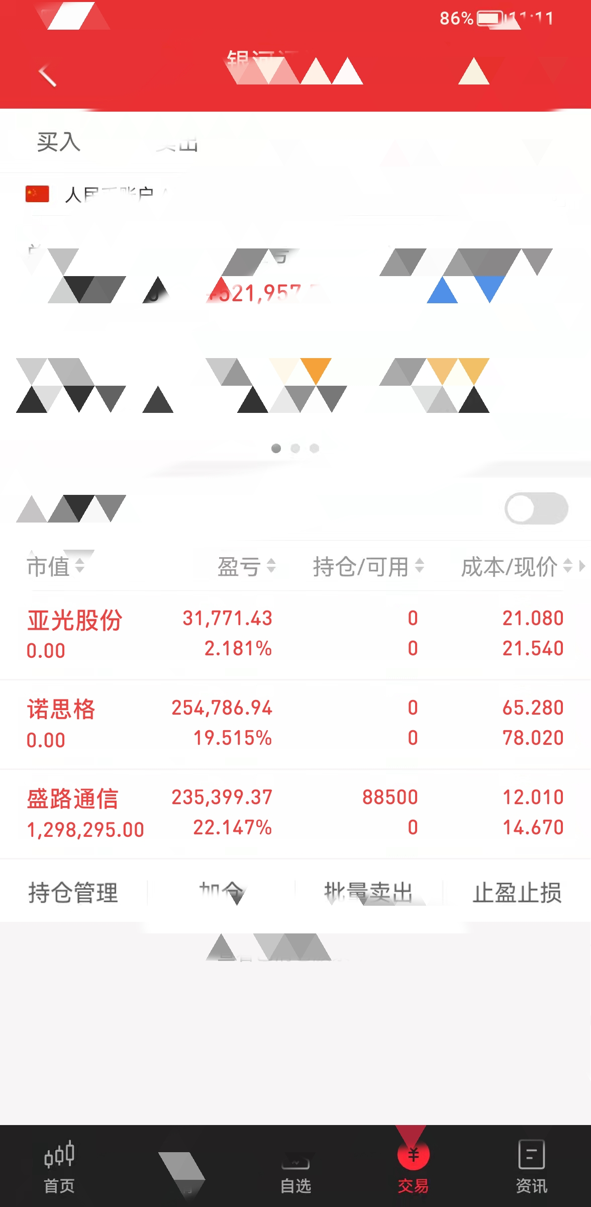 $雷科防务(SZ002413)$ 朋友们中午好!更新一下今日持仓。将亚光股份和诺思格止盈出局。新进了盛路通信,完美介入 这波地天板太给力了!持有22cm。期待明天再表现一波!$盛路通信(SZ002446)$