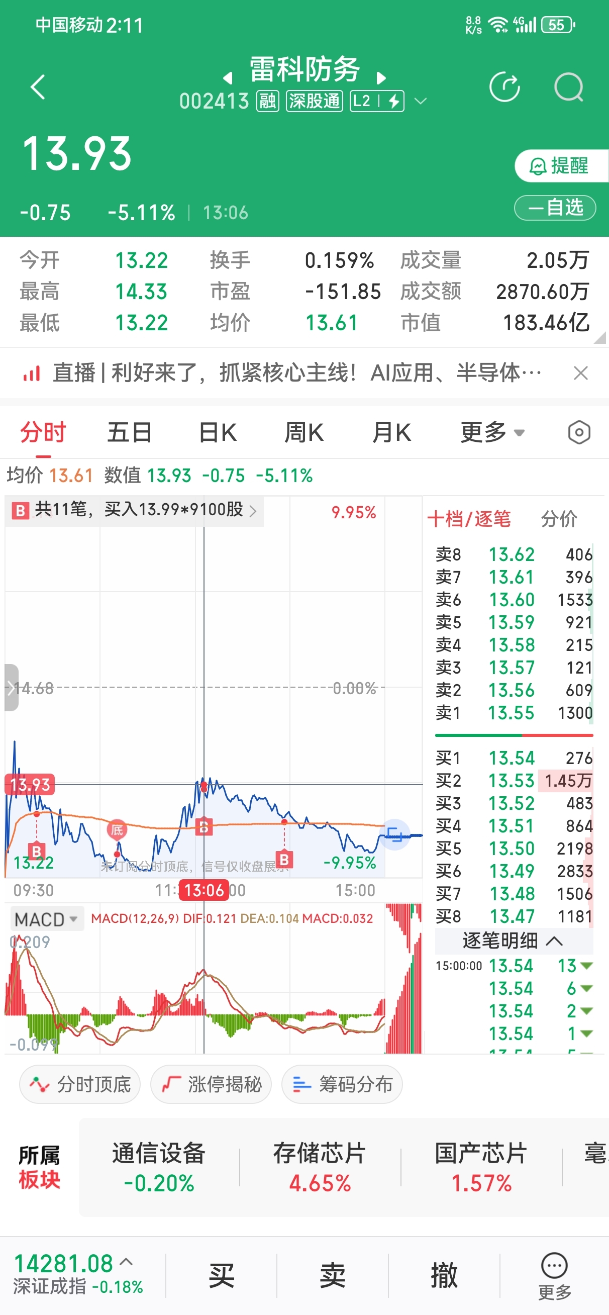 雷科防务$雷科防务(SZ002413)$ 说一说雷科防务 我昨天也是被骗进来的 也不能说是被骗 我是因为暗盘资金持续流入进来的 进来之后发现最高的时候暗盘资金流入二个多亿 我的补仓位13.99 比我的建仓位高了很多 之所以这么做就是想为攻破14元的量化压力位做出贡献虽未成功无怨无悔 为了大家的同时也为了自己 现在的股市是资本的天下 抱团才能取暖 (他们)都想收割我们 在逆境中我们在坚持