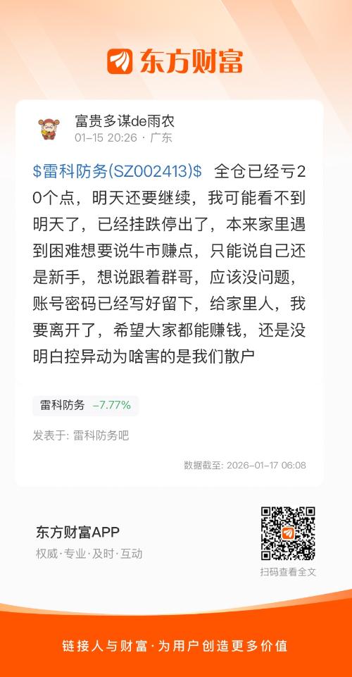 $雷科防务(SZ002413)$ 全仓已经亏20个点,明天还要继续,我可能看不到明天了,已经挂跌停出了,本来家里遇到困难想要说牛市赚点,只能说自己还是新手,想说跟着群哥,应该没问题,账号密码已经写好留下,给家里人,我要离开了,希望大家都能赚钱,还是没明白控异动为啥害的是我们散户