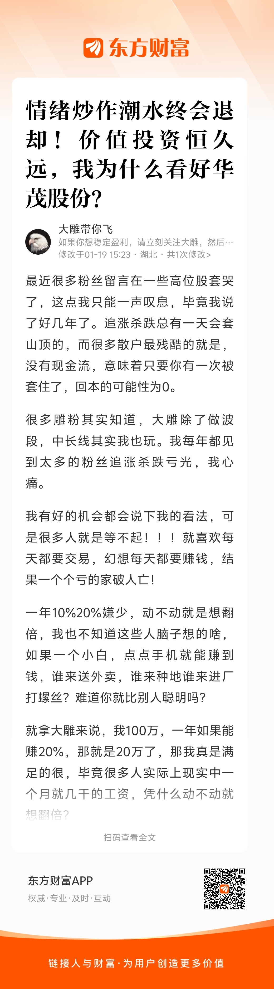 郑重声明:用户在财富号/股吧/博客等社区发表的所有信息(包括但不限于文字、视频、音频、数据及图表)仅代表个人观点,与本网站立场无关,不对您构成任何投资建议,据此操作风险自担。请勿相信代客理财、免费荐股和炒股培训等宣传内容,远离非法证券活动。请勿添加发言用户的手机号码、公众号、微博、微信及QQ等信息,谨防上当受骗!