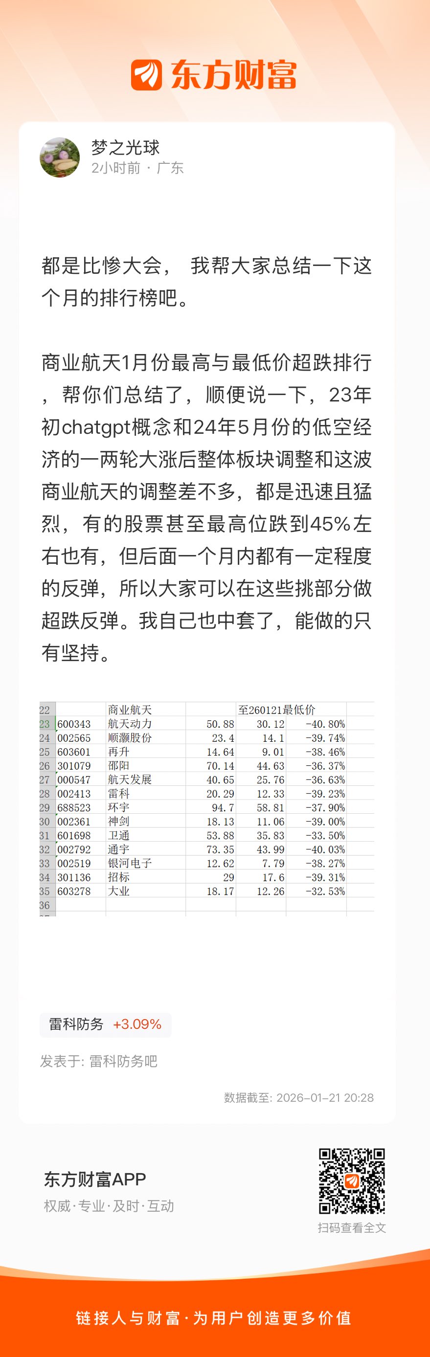 | 都是比惨大会, 我帮大家总结一下这个月的排行榜吧。 商业航天1月份最高与最低价超跌排行 ,帮你们总结了,顺便说一下,23年初chatgpt概念和24年5月份的低空经济的一两轮大涨后整体板块调整和这波商业航天的调整差不多,都是迅速且猛烈,有的股票甚至最高位跌到45%左右也有,但后面一个月内都有一定程度的反弹,所以大家可以在这些挑部分做超跌反弹。我自己也中套了,能做的只有坚持。 |
