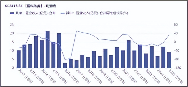 收入虽有增长,但长期来看,公司业务暗藏隐忧。首先,市场信息显示,2025年前三季度公司收入主要来自存量订单,新增订单较少,公司新获订单能力需持续关注。另外,公司80%以上收入来自军工业务,而军工业务呈典型周期性波动,一旦业务向其他军工板块转移,高度绑定军工电子的雷科防务将因无足够民用订单补足,面临收入的周期性“地震”。