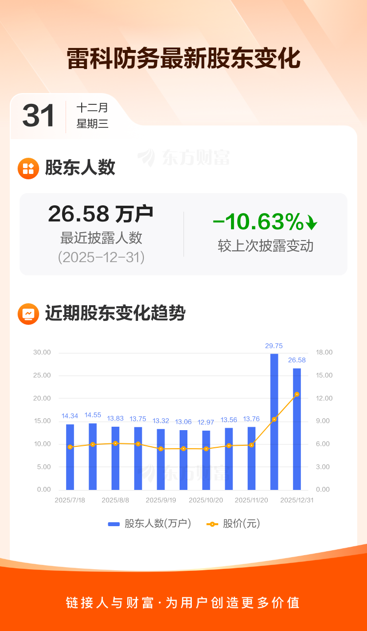 雷科防务:截至12月31日最新股东户数26.58万户,较上期减少10.63%