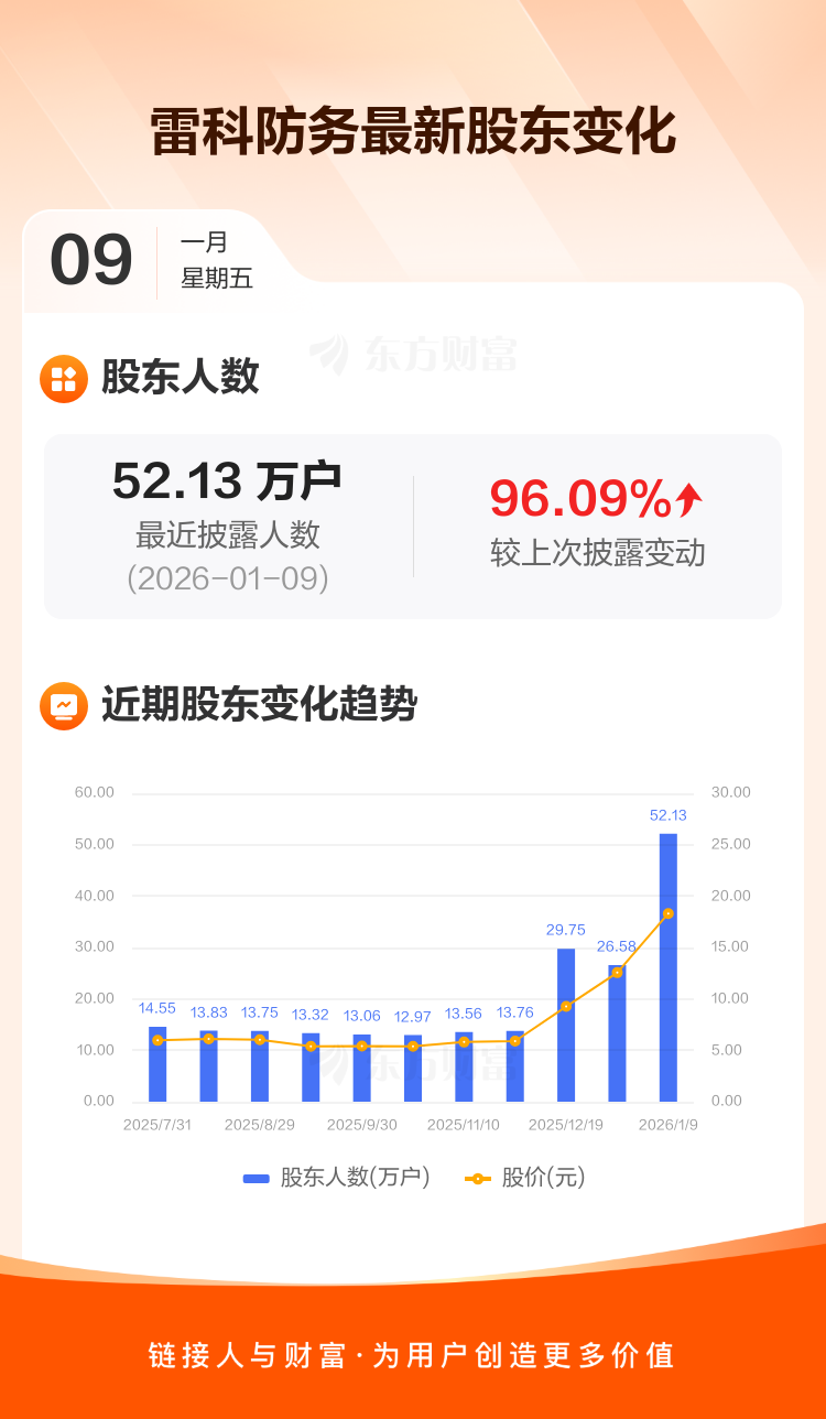 雷科防务:截至1月9日最新股东户数52.13万户,较上期增加96.09%