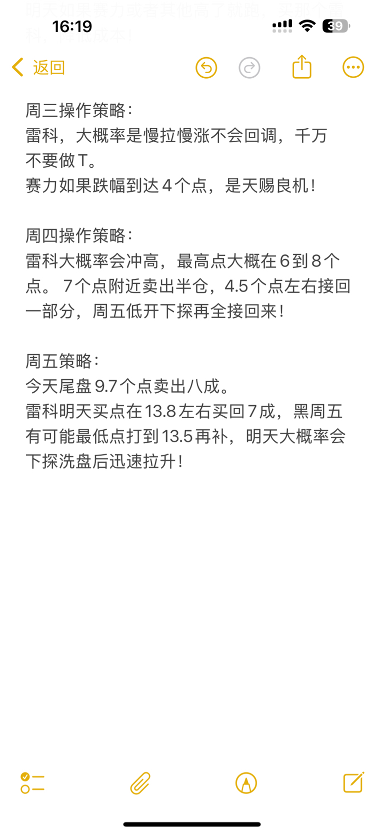 $雷科防务(SZ002413)$ 周五策略!今天有人说我写了N个第二天发,今天就提前发一下,声明写给我自己的。今天有点超预期了一点,比我猜的多涨了,明天继续看多! 笔记都是提前一天写的