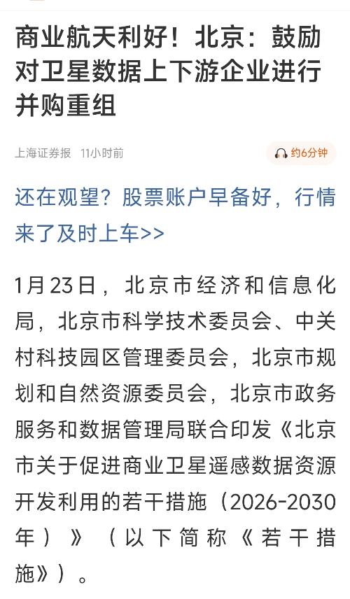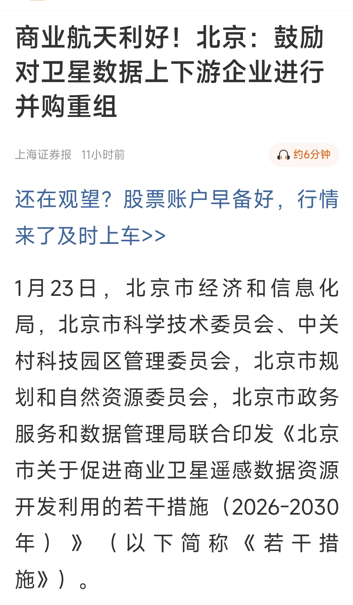 1月23日,北京市经济和信息化局,北京市科学技术委员会、中关村科技园区管理委员会,北京市规划和自然资源委员会,北京市政务服务和数据管理局联合印发《北京市关于促进商业卫星遥感数据资源开发利用的若干措施(2026-2030年)》(以下简称《若干措施》)。