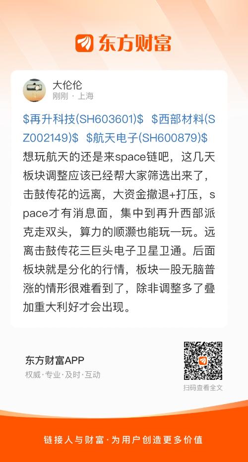 $再升科技(SH603601)$ $西部材料(SZ002149)$ $航天电子(SH600879)$ 想玩航天的还是来space链吧,这几天板块调整应该已经帮大家筛选出来了,击鼓传花的远离,大资金撤退+打压,space才有消息面,集中到再升西部派克走双头,算力的顺灏也能玩一玩。远离击鼓传花三巨头电子卫星卫通。后面板块就是分化的行情,板块一股无脑普涨的情形很难看到了,除非调整多了叠加重大利好才会出现。