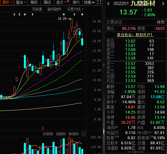 先回顾一下最近的情况:1月30日,九鼎新材资金流入2.12亿,流出2.85亿,净流出7287.03万,特大单净流出3216.72万,大单净流出4070.31万,最近三天都是净流出,但1月28日有2115.46万的净流入,而且公司1月26日发了公告,全资子公司要收购九鼎新能源100%股权,定价3950.14万元,目的是加快大型兆瓦级风电叶片生产线建设,节省时间和资金成本,这个公告是利好,但最近主力在小幅出货,所以股价震荡下行,2月2日主力会有小幅回流,但不会大举进场