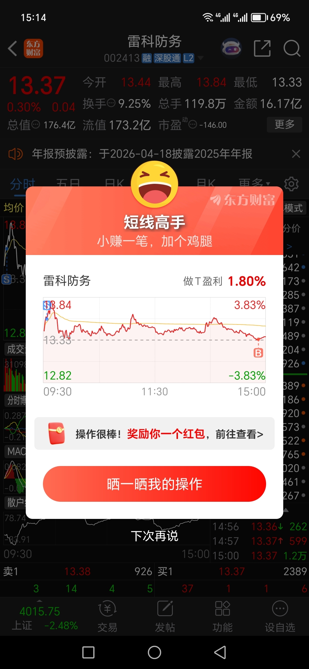 $雷科防务(SZ002413)$ 这蛋证券公司是不是盯着我的账户了?就1手也值得盯?吃饱了撑地。
