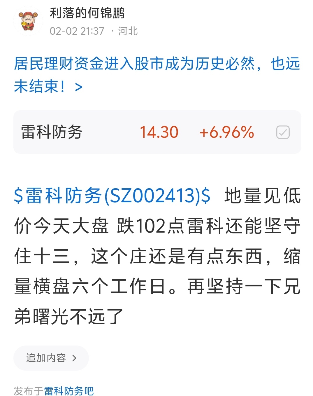 $雷科防务(SZ002413)$ 客观的说商业航天今天走的这么强如果雷科今天不封板,有可能就和他说再见了,并不是期望值大而是如果这个样子走商业航天二波的概率不大。