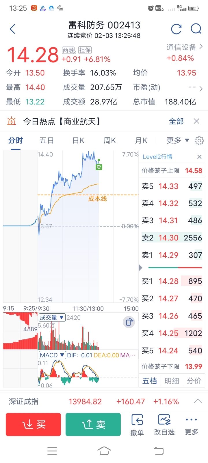 $雷科防务(SZ002413)$ 走了走了,获利两张毛爷爷