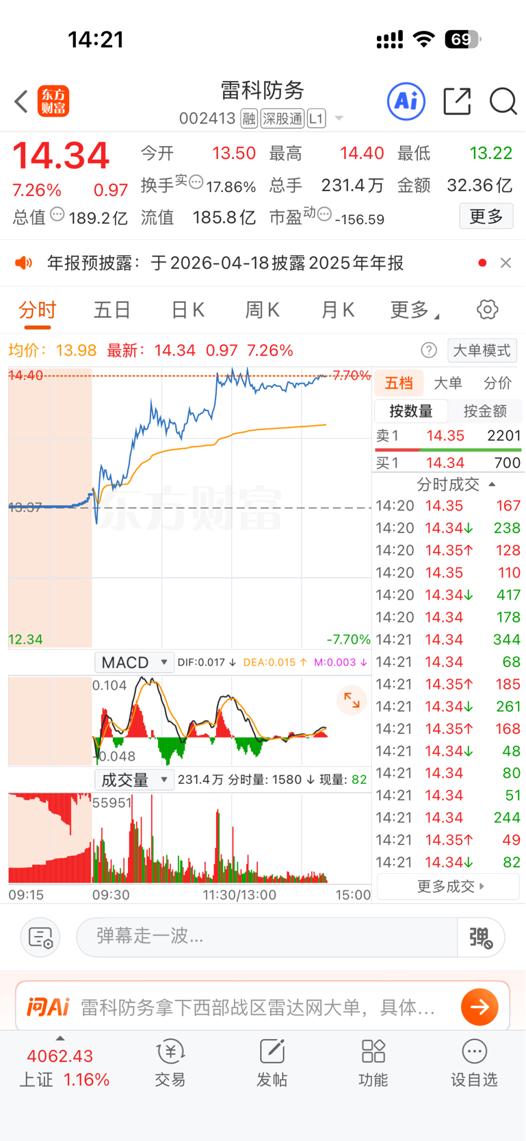 $雷科防务(SZ002413)$ 不要问为什么上不去因为我买了