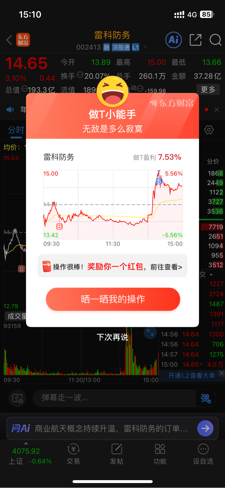 $雷科防务(SZ002413)$ 早早设置15元卖出,一下午没看手机真的卖出去了